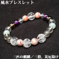 このブレスレットには三殺を鎮める力がある三匹の麒麟の他に、「翡翠」、「アゲート(瑪瑙)」、「スモーキークオーツ」といった、殺の影響を抑えるために相乗効果を得ることができるパワーストーンを組み合わせています。そして、「エレスチャル」や「アメジスト」は、健康運や精神面の支えてくれる癒しの力を与えてくれるとされ、良いエネルギーを周囲に拡散してくれる「多面カット水晶」は、自身を守ってくれるバリアとなります。