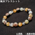 五黄殺と二黒殺は、五行の「土」の性質を持っていますので、この「土」のパワーを弱めることで、その対策ができるとされています。このブレスレットは、代表的な邪気除けのパワーストーンとして知られている天眼石を6個使用しています。この「6」という数は五行の「金」の性質を持ち、五黄殺などが属する「土」のパワーを弱めることができるとされています。そして、金の性質を持つ「ルチル」、守護石として知られる「翡翠」、さまざまな邪気を除けてくれるとされる「アゲート」を組み合わせることで、殺気から身を守る力を高めています。ご自宅や職場などが五黄殺や二黒殺の影響を受けているときに、お守りとして身につけることができるブレスレットです。