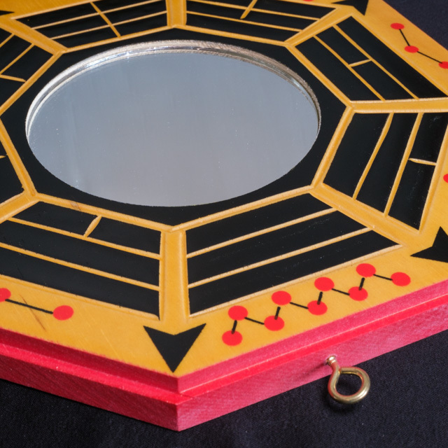 ・墓地や、葬儀場、病院、宮司のいない神社などには霊気が漂っています。こうした場所のそばは陰と陽のバランスが崩れてしまい凶運を招く恐れがあります。この鏡には、吉の気を集めて陰の気を跳ね返す効果があるとされていますので、魔除けとして入り口に吊るします。