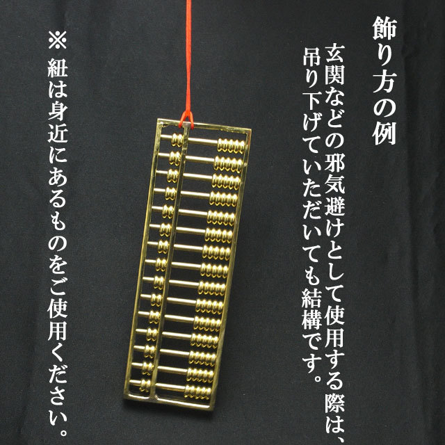 玄関や出入口の前に、高い建物や電信柱、交通標識などがあり、殺気を感じるときの化殺好転に働くとされる風水アイテムです。この場合、玄関や出入口へ紐などを用いて吊り下げてみましょう。また、算盤には、「三、八、三、八、三、八…」と、数字を入れ、算盤玉を接着剤で固定するとより効果的とされています。これは、「三十八」のもつ、五行の「木」の効果をより高め、外からやってくる「土」の災難を防いでくれるという力を活用した方法です。