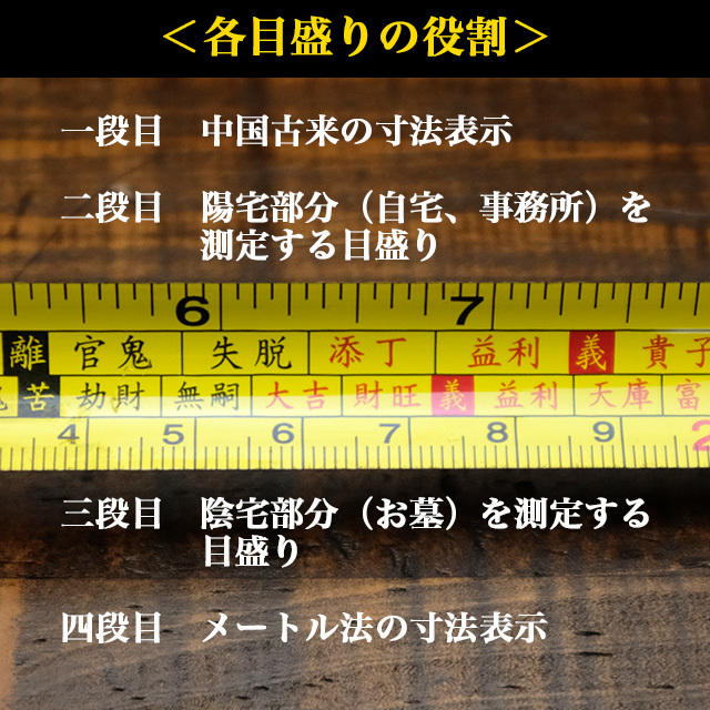 寸法の吉凶を手軽に測ることができるメジャーです。方位に吉凶があるように、寸法にも吉凶があります。その寸法の吉凶を簡単に測ることができるのが、この風水メジャー(風水尺)です。もともとは、魯班尺(ろはんじゃく)と呼ばれている道具を現代風にアレンジしたものです。