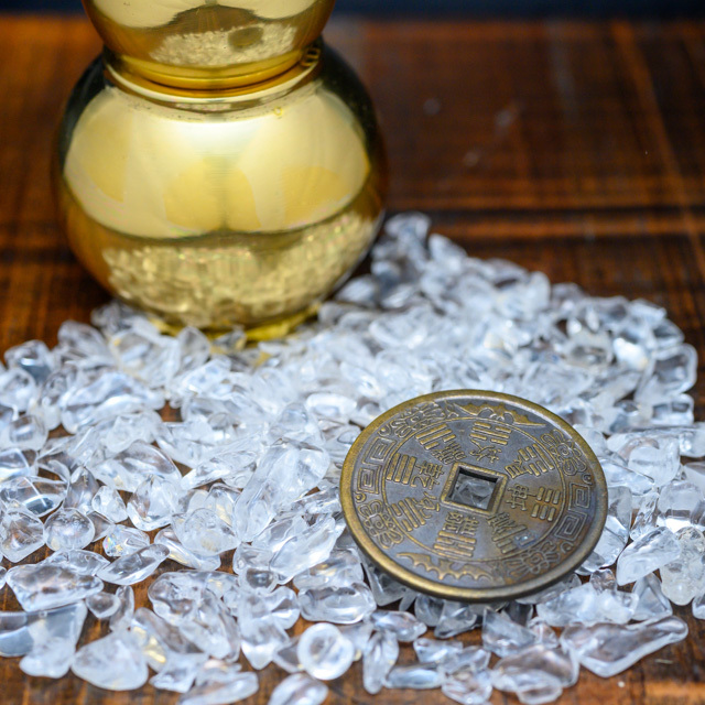 そして、このセットには、「水晶のさざれ」をお付けしています。銅製のフールーの中に水晶のさざれを入れることで、フールーが吸い込んで閉じ込めた「殺気」を浄化する手助けをし、「収殺」の作用をより高めることができます。