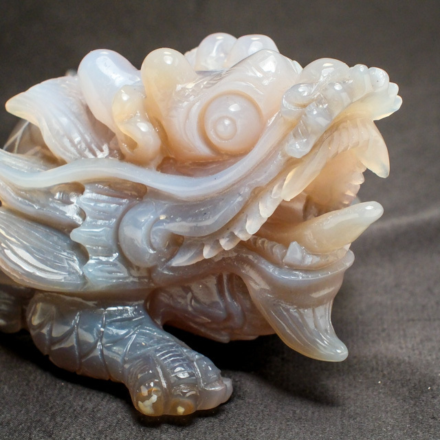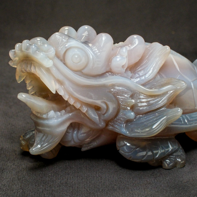 本品は、瑪瑙(メノウ)の原石を使用して彫刻された「龍亀(ロングイ)」です。