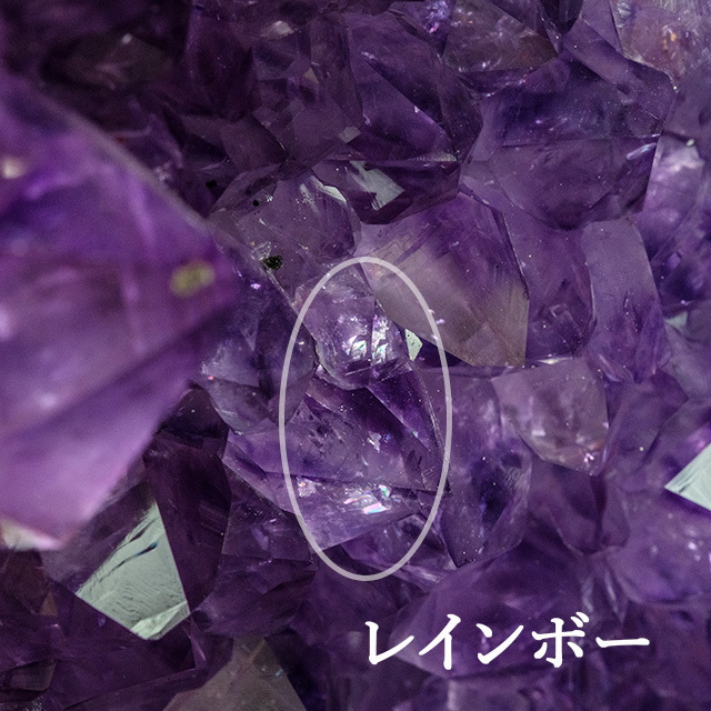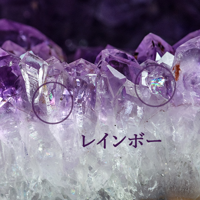 【願望達成】レインボーが入っている。結晶内部に生じたひびが光を反射する時に、虹色に見えるものがあります。この虹は願いを叶える力を与えてくれるとされています。今、特別な願いがあるのなら、きっと願いを叶えるためのパワーを多く集めてくれることでしょう。