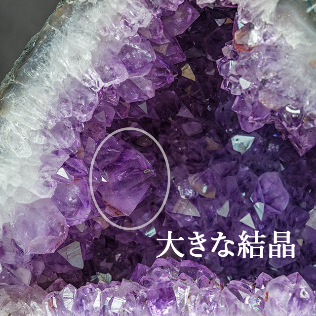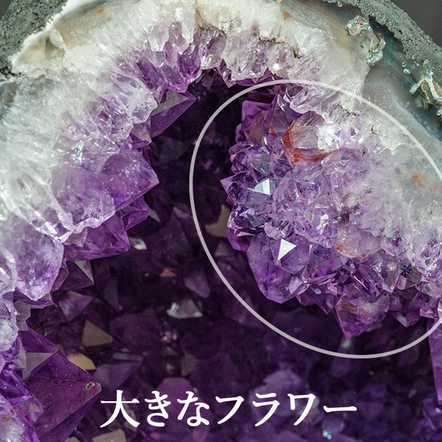 【財が膨らむ】大きなフラワーと、大きな結晶が突き出している。ドーム内にフラワーと呼ばれる盛り上がった結晶群や、周りの結晶より一際大きく突き出した結晶は、財が膨らむ様を表しているとされています。このアメジストドームには、大きなフラワーと大きな結晶が存在し、他にも小さな盛り上がりも確認できます。「集めた財を大きく膨らませる。」という殖財に関する意味がとても強い一品と言えます。